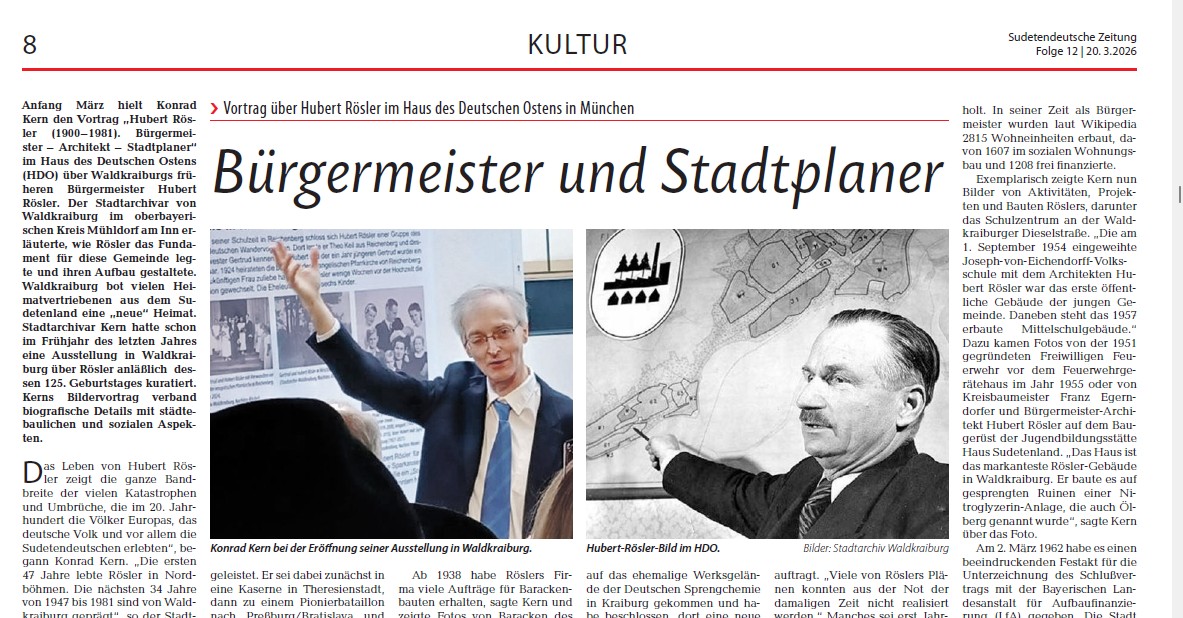 Anfang März hielt unser zweiter Vorsitzender, der Waldkraiburger Stadtarchivar Konrad Kern, im Haus des Deutschen Ostens einen Vortrag über den ersten Bürgermeister der damaligen jungen Gemeinde Waldkraiburg, Herrn Hubert Rösler. Anlass war dessen 125. Geburtstag, der im vergangenen Jahr in Waldkraiburg mit einer Ausstellung gefeiert wurde.