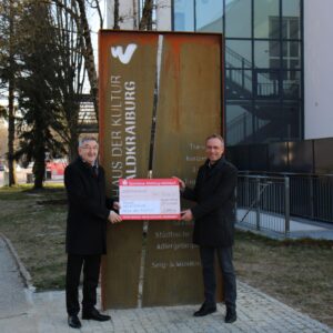 Übergabe eines Schecks über 10.000 Euro des Vereins an Ersten Bürgermeister Robert Pötzsch zur Finanzierung einer Informationstafel beim haus der Kultur |